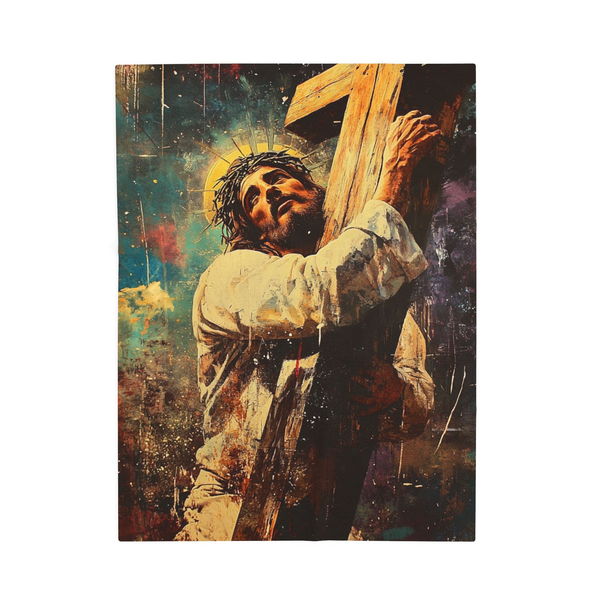Wrap yourself in comfort and warmth with this luxurious velveteen plush blanket. Featuring a stunning, high-detail print on one side, this blanket is perfect for cozy nights in or adding a splash of color to your living space. The soft texture invites relaxation, making it an ideal companion for movie nights or reading a good book. It's especially meaningful for those who appreciate artistic representations of faith and spirituality, suitable for adults looking to enhance their home decor. This blanket is a thoughtful gift for various occasions like Christmas, birthdays, or even as a comforting piece in times of reflection or remembrance. Embrace a sense of warmth and inspiration in your life with this beautiful velveteen blanket.